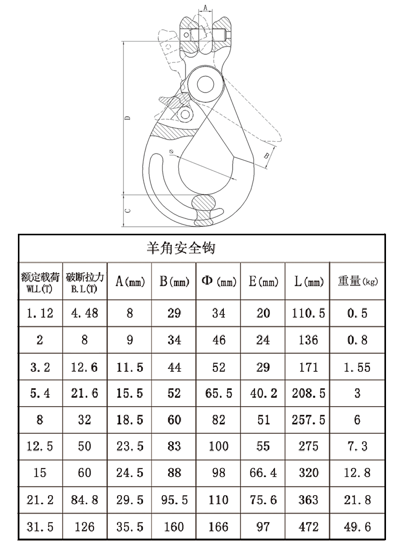 羊角安全鉤技術(shù)參數(shù): ITEM NO. WLL/T B.L/T A B C D 8-SL1002-06 1.12 4.48 8 29 34 20 95.5 8-SL1002-7/8 2 8 9 34 46 24 121 8-SL1002-10 3.15 12.6 11.5 44 52 29 146 8-SL1002-13 5.4 21.6 15.5 52 65.5 40.2 182 8-SL1002-16 8 32 18.5 60 82