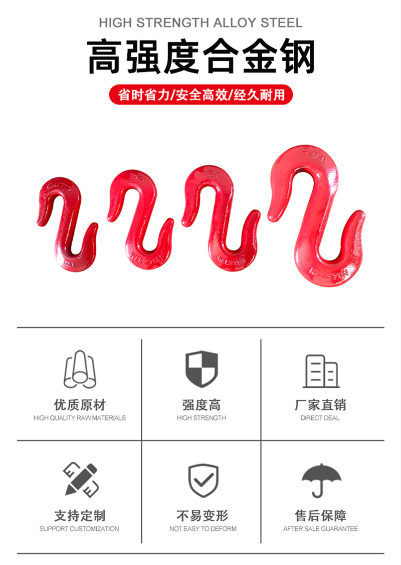 我司生產(chǎn)的S型吊鉤采用高級合金材料,使承受以外超負荷工作時不發(fā)生斷裂,只是逐漸變形,安全系數(shù)更高。嚴謹?shù)纳a(chǎn)流程包括:中頻淬火處理、流水作業(yè)、表面靜電噴塑多種顏色更能滿足不同客戶需求,本公司現(xiàn)可提供OEM產(chǎn)品定制服務,盡最大限度滿足您的需求。