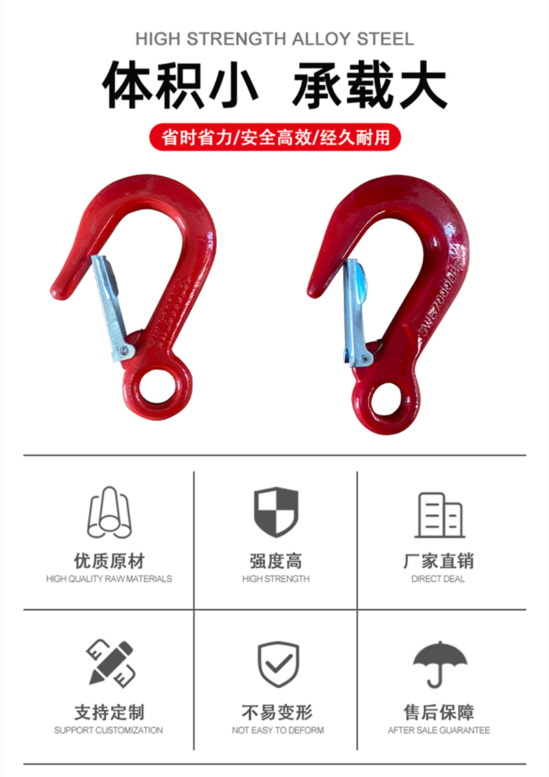 我司生產(chǎn)的5000磅7000磅吊鉤采用高級(jí)合金材料,使承受以外超負(fù)荷工作時(shí)不發(fā)生斷裂,只是逐漸變形,安全系數(shù)更高;鉤頭處全新設(shè)計(jì),使貨物不會(huì)脫鉤。嚴(yán)謹(jǐn)?shù)纳a(chǎn)流程包括:中頻淬火處理、流水作業(yè)、表面靜電噴塑多種顏色更能滿足不同客戶需求,本公司現(xiàn)可提供OEM產(chǎn)品定制服務(wù),盡最大限度滿足您的需求。