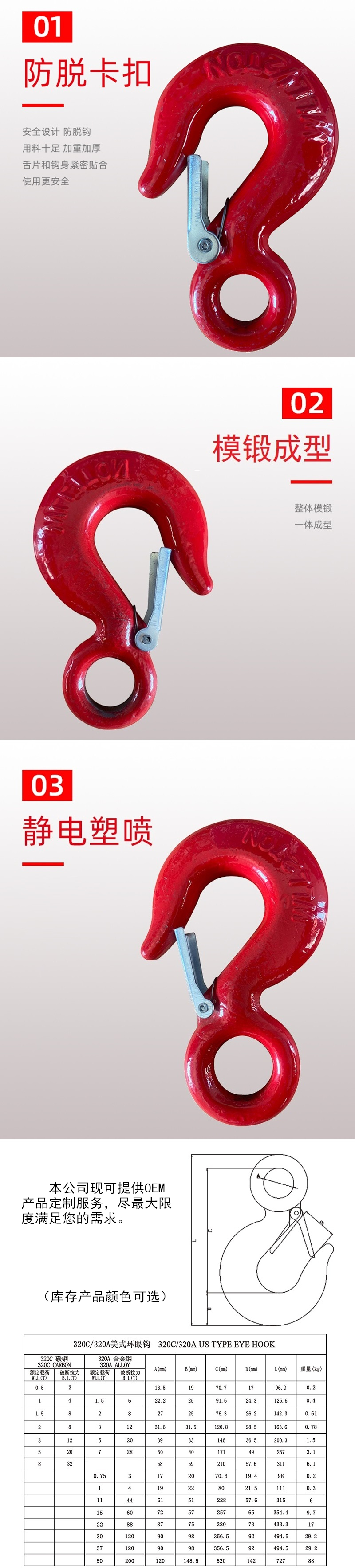 80級環(huán)眼吊鉤采用高級合金材料,使承受以外超負(fù)荷工作時不發(fā)生斷裂,只是逐漸變形,安全系數(shù)更高;鉤頭處全新設(shè)計,使貨物不會脫鉤。吊鉤常借助于滑輪組等部件懸掛在起升機構(gòu)的鋼絲繩上。