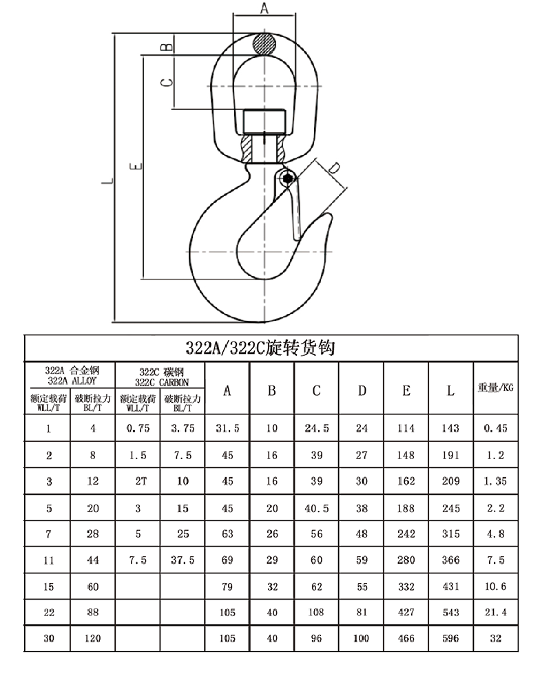 旋轉安全鉤技術參數(shù): 322A 322C Weight(kg) WLL/T B.L/T WLL/T B.L/T 1 4 3/4 3 0.35 1 1/2 6 1 4 0.58 2 8 1 1/2 6 1.04 3 12 2 8 1.18 4 1/2 18 3 12 2.2 7 28 5 20 4.71 11 44 7 1/2 30 7.46 15 60 10 40 10.65