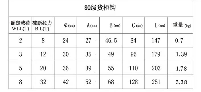羊角安全鉤技術參數(shù): ITEM NO. WLL/T B.L/T A B C D 8-SL1002-06 1.12 4.48 8 29 34 20 95.5 8-SL1002-7/8 2 8 9 34 46 24 121 8-SL1002-10 3.15 12.6 11.5 44 52 29 146 8-SL1002-13 5.4 21.6 15.5 52 65.5 40.2 182 8-SL1002-16 8 32 18.5 60 82