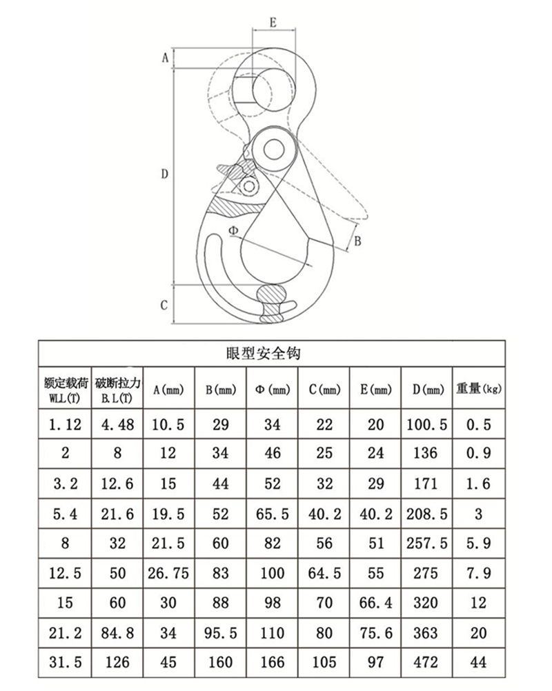 羊角安全鉤技術(shù)參數(shù): ITEM NO. WLL/T B.L/T A B C D 8-SL1002-06 1.12 4.48 8 29 34 20 95.5 8-SL1002-7/8 2 8 9 34 46 24 121 8-SL1002-10 3.15 12.6 11.5 44 52 29 146 8-SL1002-13 5.4 21.6 15.5 52 65.5 40.2 182 8-SL1002-16 8 32 18.5 60 82